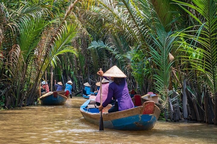 Glide along narrow canals on a traditional rowing boat, shaded by water coconut palms, and experience the authentic rural lifestyle of the Mekong Delta.
