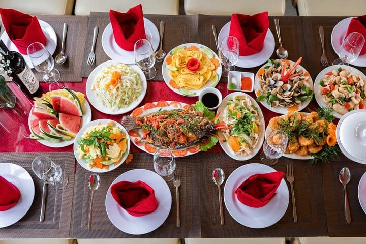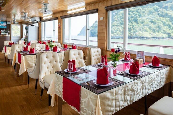 As the day winds down, relax on deck with a sunset party, savoring red wine, cake, fresh fruit, and more while cruising past towering limestone cliffs bathed in golden light. Whether you’re gliding over calm waters or admiring the breathtaking vistas from above, this Halong Bay experience promises a perfect blend of relaxation, adventure, and natural beauty.