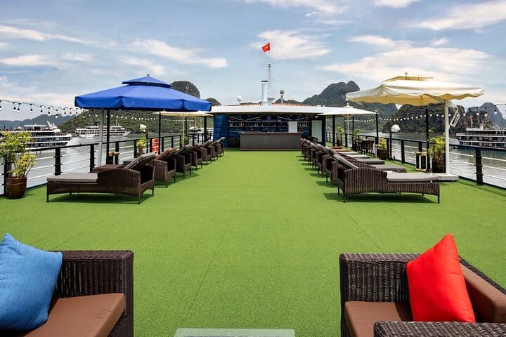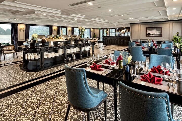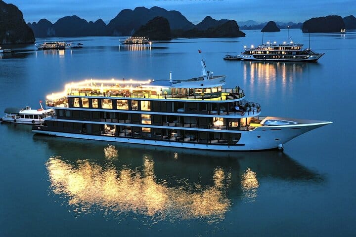 oris Cruise redefines luxury in Ha Long Bay as the first 5-star cruise to feature an onboard swimming pool. Each spacious cabin comes with a private balcony, granting guests uninterrupted views of the bay’s awe-inspiring landscapes. With carefully curated itineraries found nowhere else, Doris Cruise takes you beyond the ordinary to uncover the hidden charms of both Lan Ha Bay and Ha Long Bay. Highlights include swimming and kayaking at Ba Trai Dao Islet, exploring the mystical Dark & Bright Cave, and cruising past iconic landmarks such as Con Vit Islet, Thumb Islet, and Gia Luan Harbor. Blending elegance, adventure, and relaxation, Doris Cruise promises unforgettable memories on the sparkling waters beneath golden
