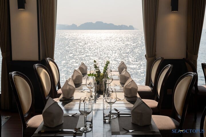 Inspired by Halong’s iconic specialty, the Sea Octopus Cruise was designed to offer guests an unforgettable journey that awakens every sense. Glide through the breathtaking seascapes of Halong Bay while savoring refined cuisine, relaxing in elegant spaces, and enjoying world-class service. Onboard, you’ll discover two spacious restaurants, three exclusive VIP dining rooms, a chic bar and lounge, and expansive sundecks ideal for both leisure and activities. Crafted with premium steel construction for the highest standards of safety and staffed by a professional, attentive crew, Sea Octopus Cruise promises not just a voyage—but an extraordinary culinary and cultural experience in the heart of Halong Bay.